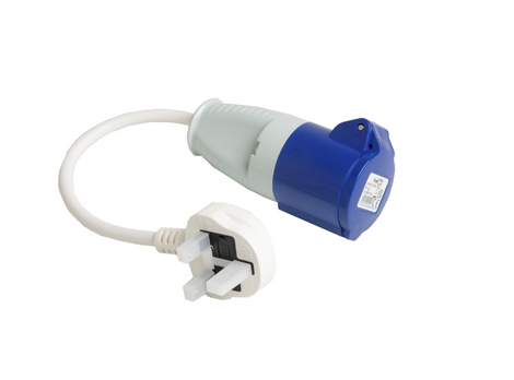 MP374 230V UK Hook-up Lead 230V mains hook up adaptor enables your caravan to be connected to mains power via a domestic 3 pin socket Fitted with a 3 pin UK plug BS1363-1 16 amp Splash-proof connector conforming to IEC60309-2 Approx. 26cm of 3 core orange 230V mains cable
